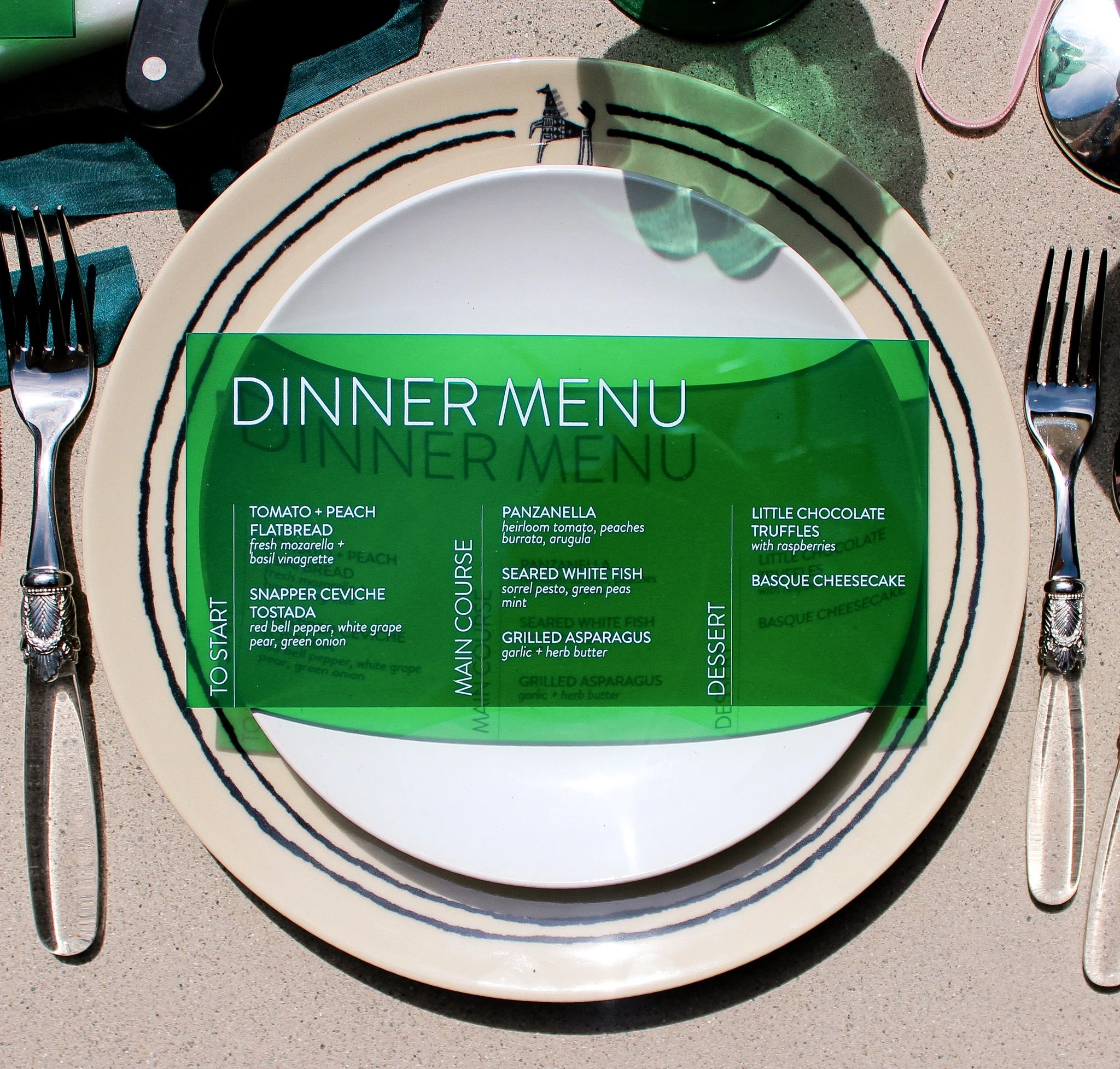 Our Place Setting Dinner Menus are designed to serve as individual menus for each guest. Our Leather Dinner Menus are printed on genuine leather in three rich colors: Saddle Brown, Ebony, and Midnight.